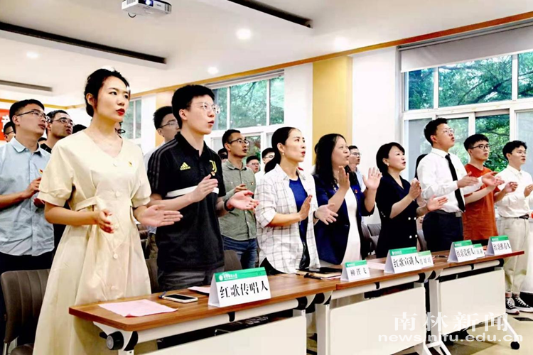院党委副书记、副院长柳任飞带领全体党员再次重温入党誓词,重忆初心。在支部书记们的带领下,各支部师生党员共唱《没有共产党就没有新中国》,将现场气氛推向高潮。