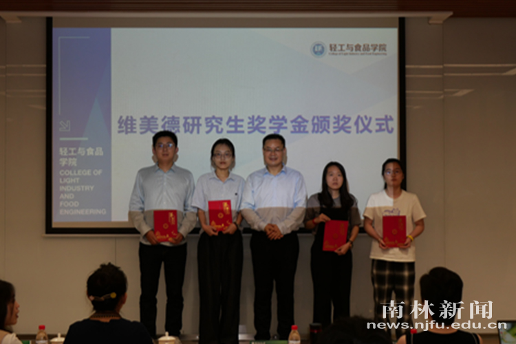 颁奖环节中,轻工与食品学院团委书记、学工办主任杨韦正式宣布了2025年维美德研究生奖学金获奖名单。经过第三届“南山争鸣”研究生学术论坛选拔,14名优秀研究生获奖。维美德公司代表为获奖同学颁发证书并合影。