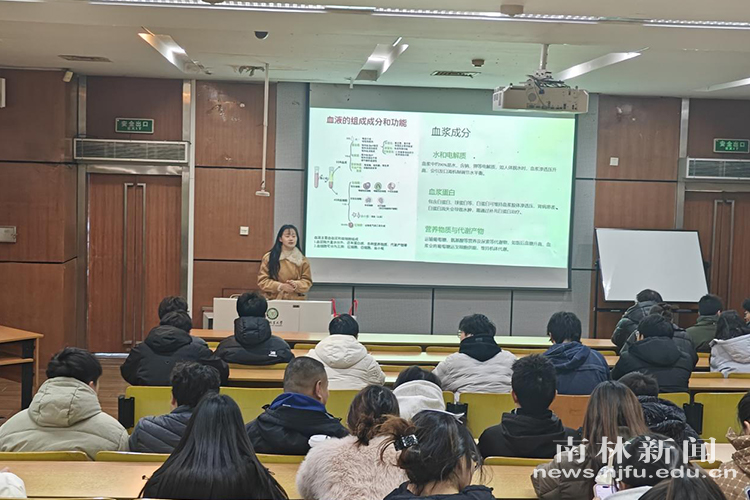 【南林新闻中心讯】为普及血液知识,提高在校学生对血液健康、临床用血及无偿献血政策的科学认知,增强青年学子的社会责任感和奉献精神,1月8日,由后勤管理处、轻工与食品学院联合主办,轻工与食品学院学生会、红十字会共同承办的血液知识科普讲座在阶1教室顺利举行。讲座特邀江苏省血液中心张珊珊老师担任主讲,轻工与食品学院团委书记杨韦老师主持活动,来自各学院的100余名学生积极参与。