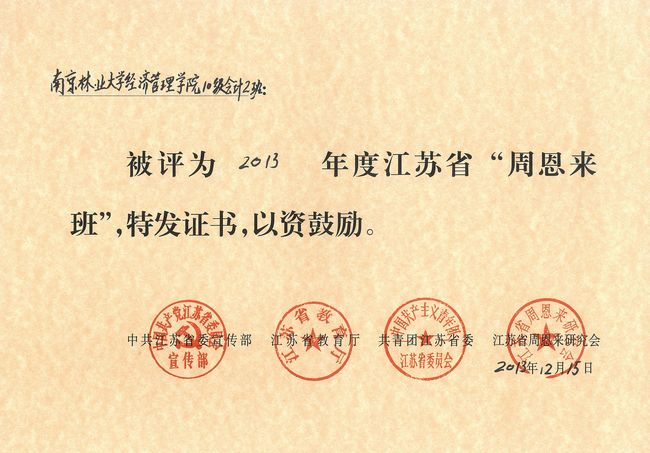 江苏省“周恩来班”创建活动是由省委宣传部、省教育厅、团省委、省周恩来研究会联合举办,自2010年5月在全省中小学首次命名表彰60个班级以来,全省创建“周恩来班”活动得到很大推动,不少高等学校也积极开展这项活动。为了更好地推进“周恩来班”创建活动的开展,今年决定再命名表彰南京林业大学经济管理学院2010级会计2班等43个班级为江苏省“周恩来班”。开展创建“周恩来班”活动,用周恩来同志的光辉业绩、高尚品德、崇高精神、感人事迹去感染和教育青少年学生,是贯彻落实党的十八大精神,把立德树人作为教育的根本任务,培养德智体美全面发展的社会主义建设者和接班人的有效载体。